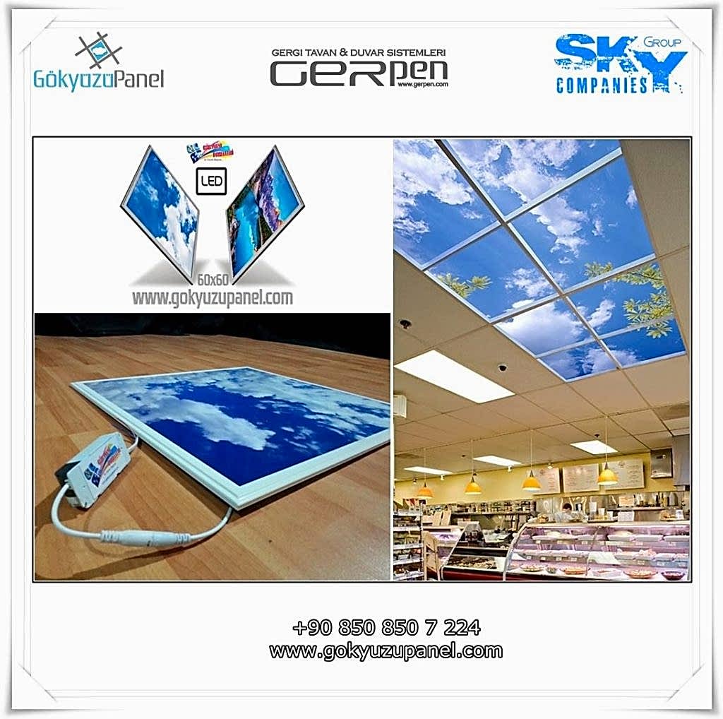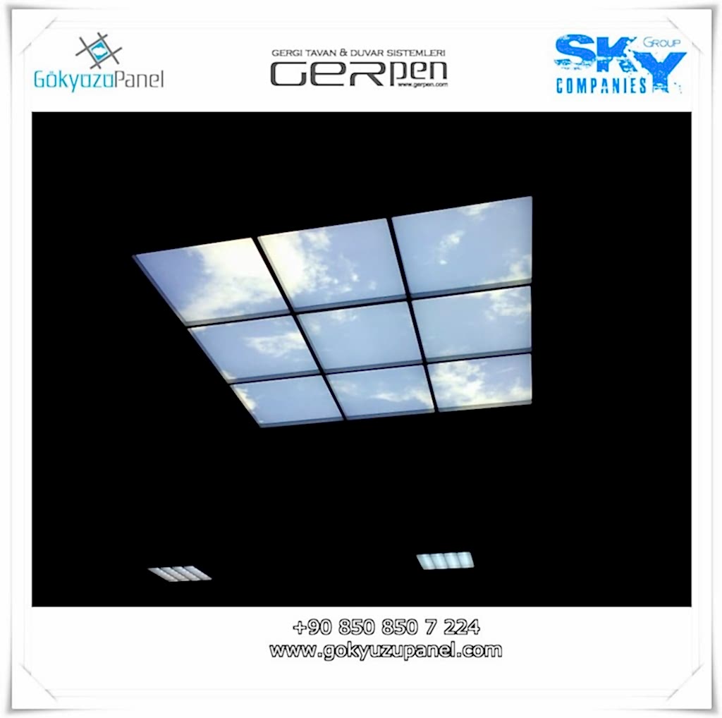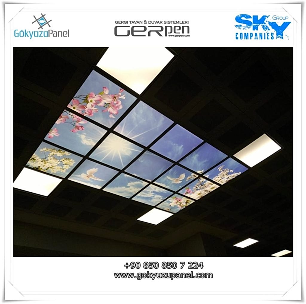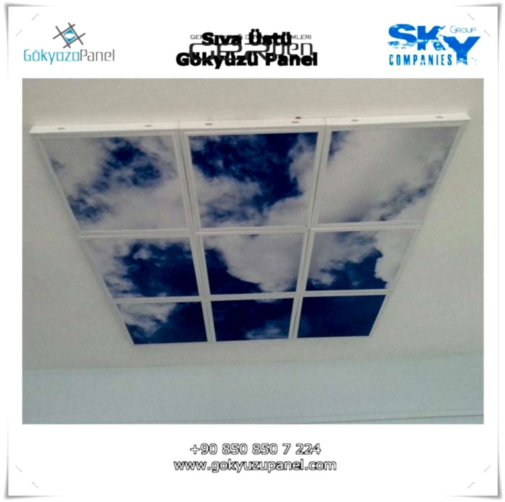 Gökyüzü Panel ürünlerinde ise durum tamamen farklıdır. Mevcut T24 taş yünü asma tavan sistemlerine ( sıva altı ) birebir uyum sağlar. 60×60, 60×120, 30×30, 30×60, 30×120, 15×120 gibi uluslararası asma tavan panelleri standart ölçülerine sahiptir. T24 Asma tavan ızgarası olmayan bölümlerde yine kutu alçıpan ile oluşturulan tavanlarda da kolayca kullanılabilir. Led Panel yapısı benzeri iç yanlardan led aydınlatmalı, homojen ışık dağılımı sunar. Böylece ışığı her santim de eşit alırsınız. Pleksiglas ön yüzeyi ve istenilen her görselin baskısının yapılabileceği sağlam, özel ve kullanışlı ürünlerdir. Montajı son derece basit olan bu ürünler sadece elektrik bağlantısına ihtiyaç duyar. Desen ve görseller her panel de özel ve ayrı olabileceği gibi birbirini takip eden puzzle şeklinde de oluşturulabilir. Oluşan kareli, dikdörtgen, oval ve benzeri puzzle görüntüler yapılan aydınlatma ve dekorasyona daha estetik bir görünüm kazandırır. Kullanım esnasında herhangi bir sorun yaşandığı zaman sorunlu panel çok kolay bir şekilde yenisi ile değiştirilebilir. Mevcut mekandan taşınma gibi durumlarda paneller çok kolay bir şekilde tavandan alınıp taşınabilir, yeni mekanda kullanılabilir.