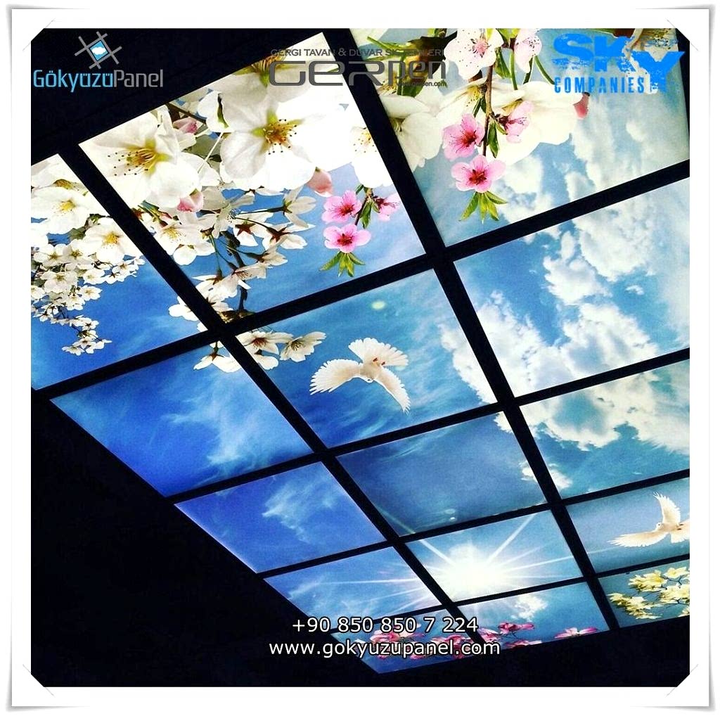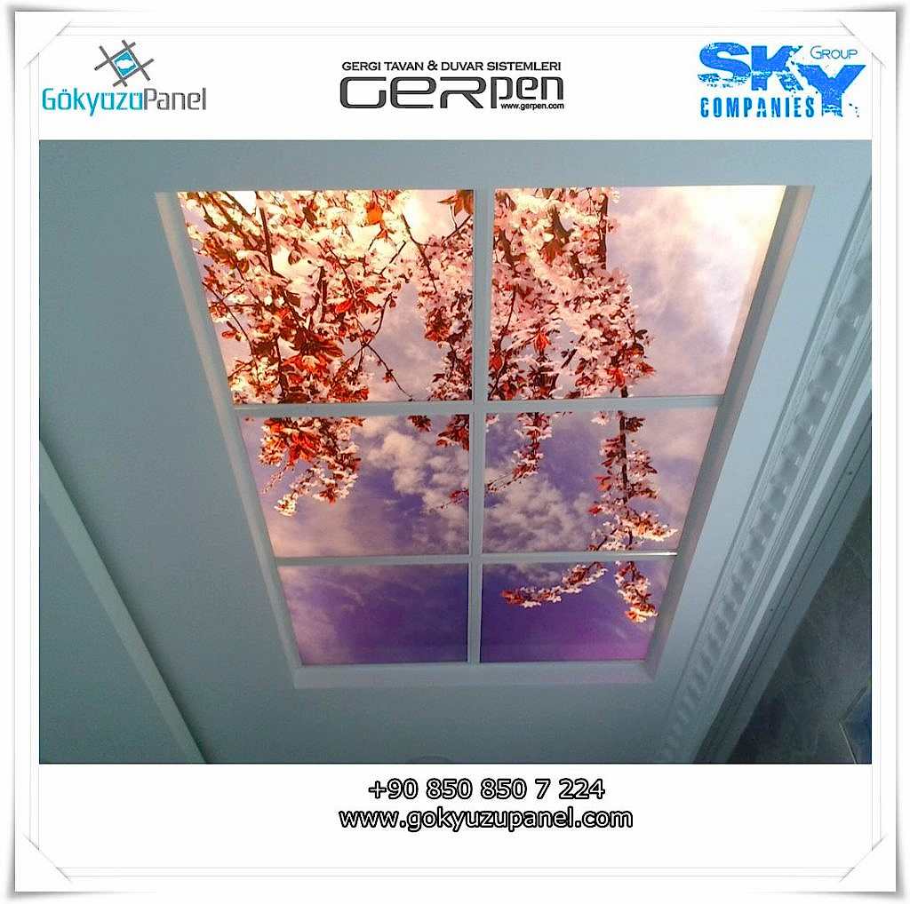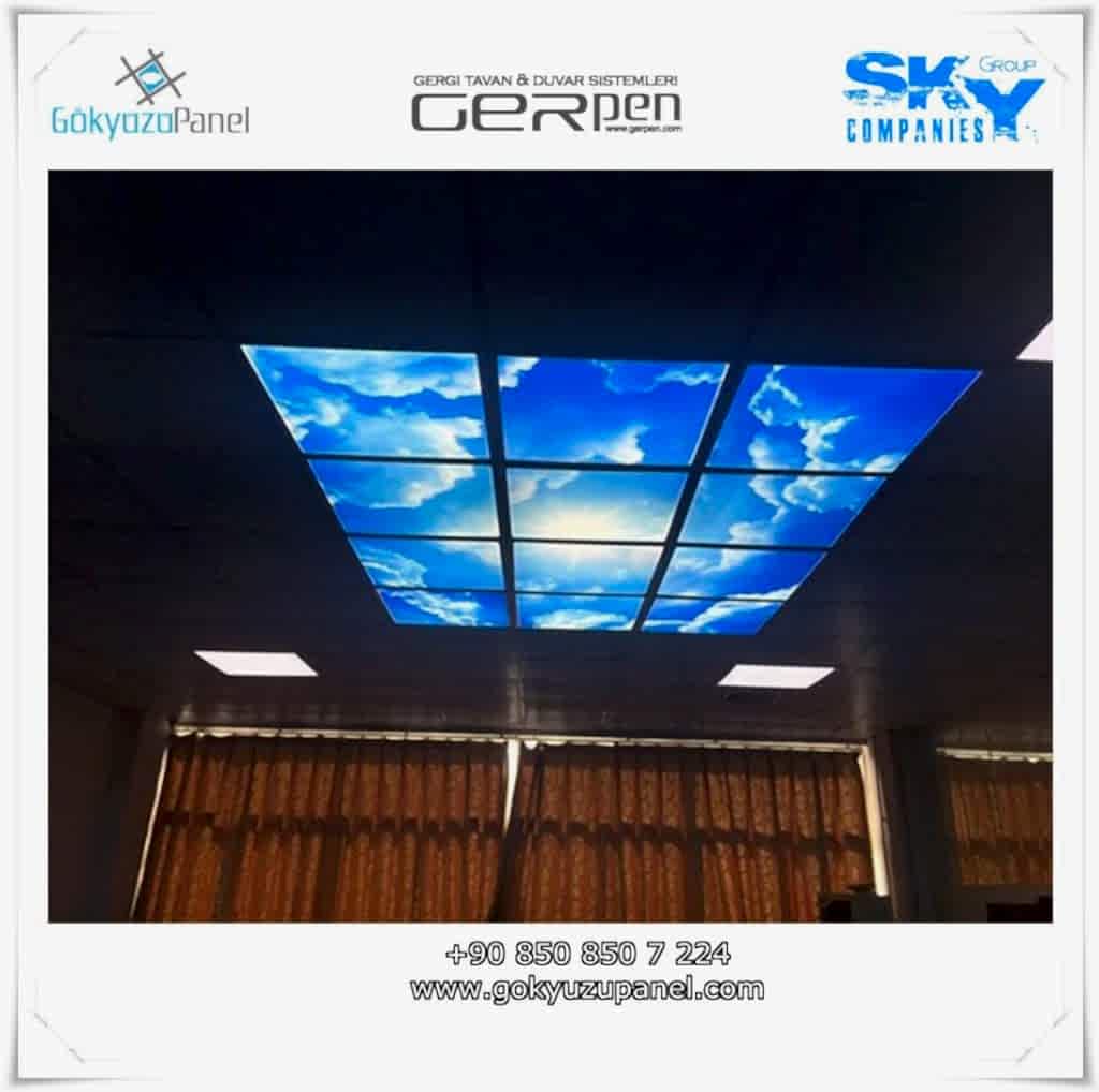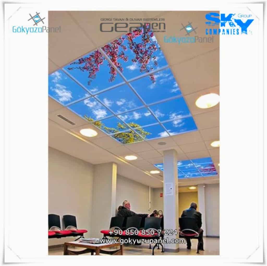 Gökyüzü Panel ürünlerinde ise durum tamamen farklıdır. Mevcut T24 taş yünü asma tavan sistemlerine ( sıva altı ) birebir uyum sağlar. 60×60, 60×120, 30×30, 30×60, 30×120, 15×120 gibi uluslararası asma tavan panelleri standart ölçülerine sahiptir. T24 Asma tavan ızgarası olmayan bölümlerde yine kutu alçıpan ile oluşturulan tavanlarda da kolayca kullanılabilir. Led Panel yapısı benzeri iç yanlardan led aydınlatmalı, homojen ışık dağılımı sunar. Böylece ışığı her santim de eşit alırsınız. Pleksiglas ön yüzeyi ve istenilen her görselin baskısının yapılabileceği sağlam, özel ve kullanışlı ürünlerdir. Montajı son derece basit olan bu ürünler sadece elektrik bağlantısına ihtiyaç duyar. Desen ve görseller her panel de özel ve ayrı olabileceği gibi birbirini takip eden puzzle şeklinde de oluşturulabilir. Oluşan kareli, dikdörtgen, oval ve benzeri puzzle görüntüler yapılan aydınlatma ve dekorasyona daha estetik bir görünüm kazandırır. Kullanım esnasında herhangi bir sorun yaşandığı zaman sorunlu panel çok kolay bir şekilde yenisi ile değiştirilebilir. Mevcut mekandan taşınma gibi durumlarda paneller çok kolay bir şekilde tavandan alınıp taşınabilir, yeni mekanda kullanılabilir.